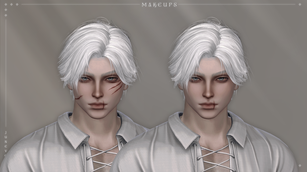 There are also two eye heterocromia options, four makeup options, full lash and brow retexture with a custom UV placement, five face toggles (2 face decals, eyeliner decal, blank eye lens, human and elf ears), custom normal and mask maps, custom eye retexture, custom teeth and tongue (both poseable) and five lash color options!