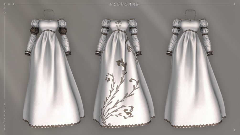 It also features three color options for the lace, three for the pearls (which are toggleable both on the necklace and on the dress), and eight pattern options for the dress!