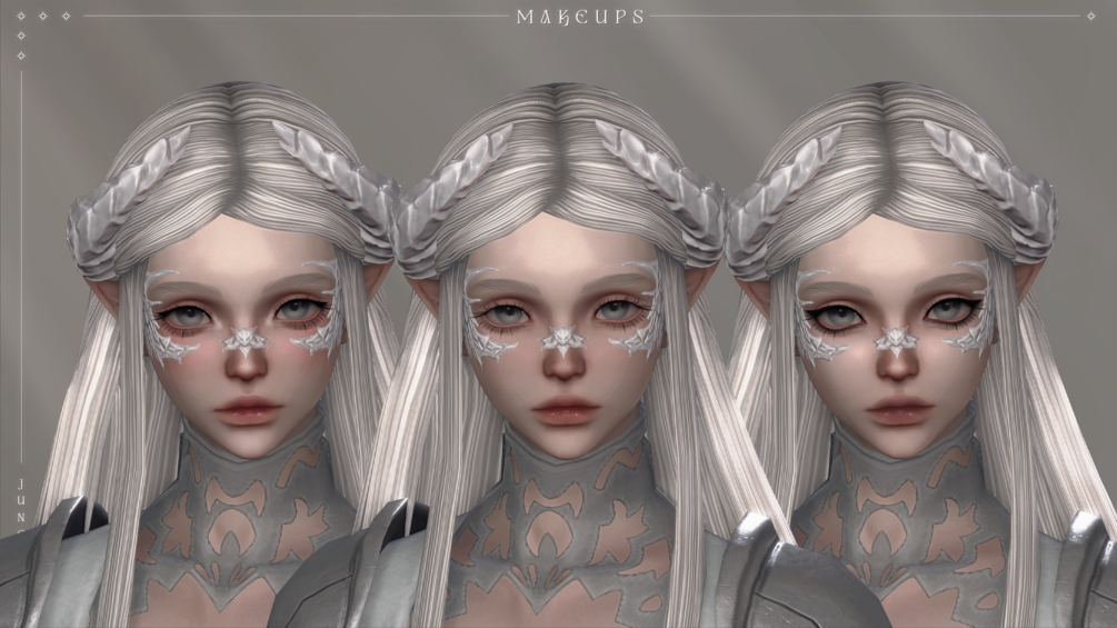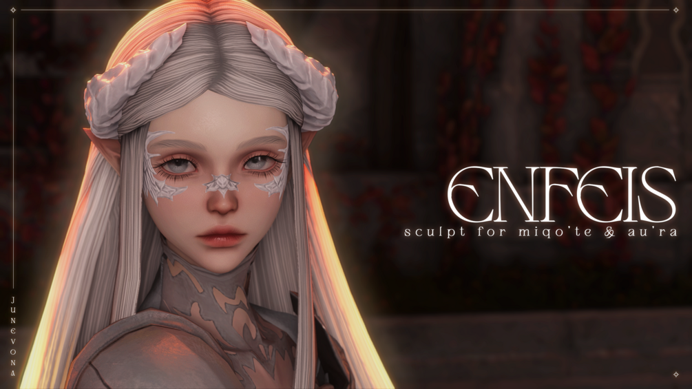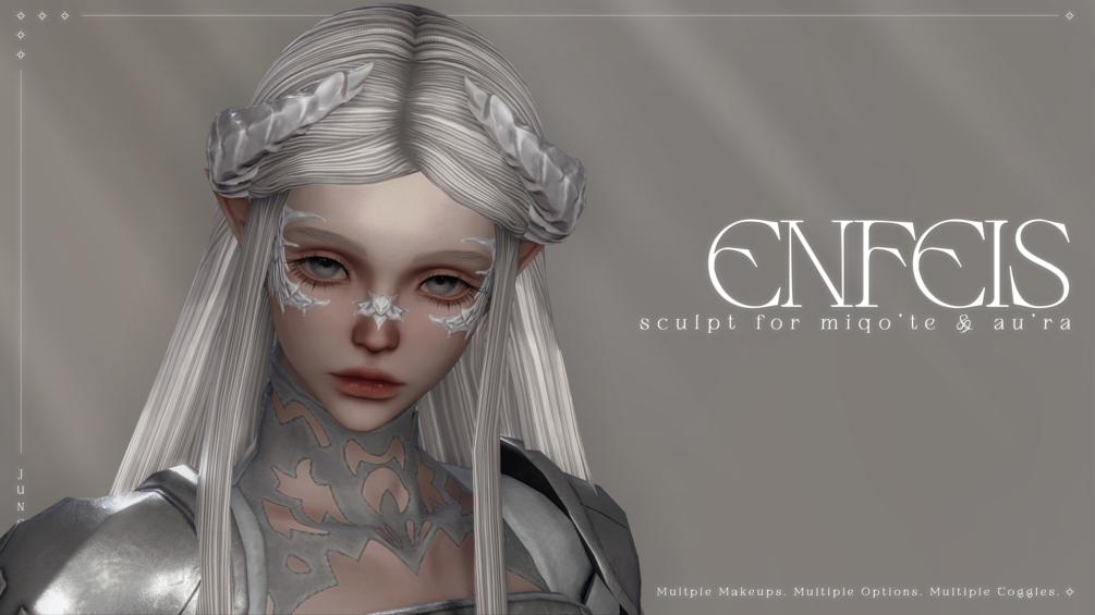 There are also two eye heterocromia options, three makeup options, full lash and brow retexture with a custom UV placement, five face toggles (2 moles, three custom face scales and custom horns with color options - you can toggle them in glamourer or the aesthetician), custom normal and mask maps, custom eye retexture, custom teeth and tongue (both poseable), custom elf and human ears, vanilla miqo'te ear flaps and au ra horns and five lash color options!